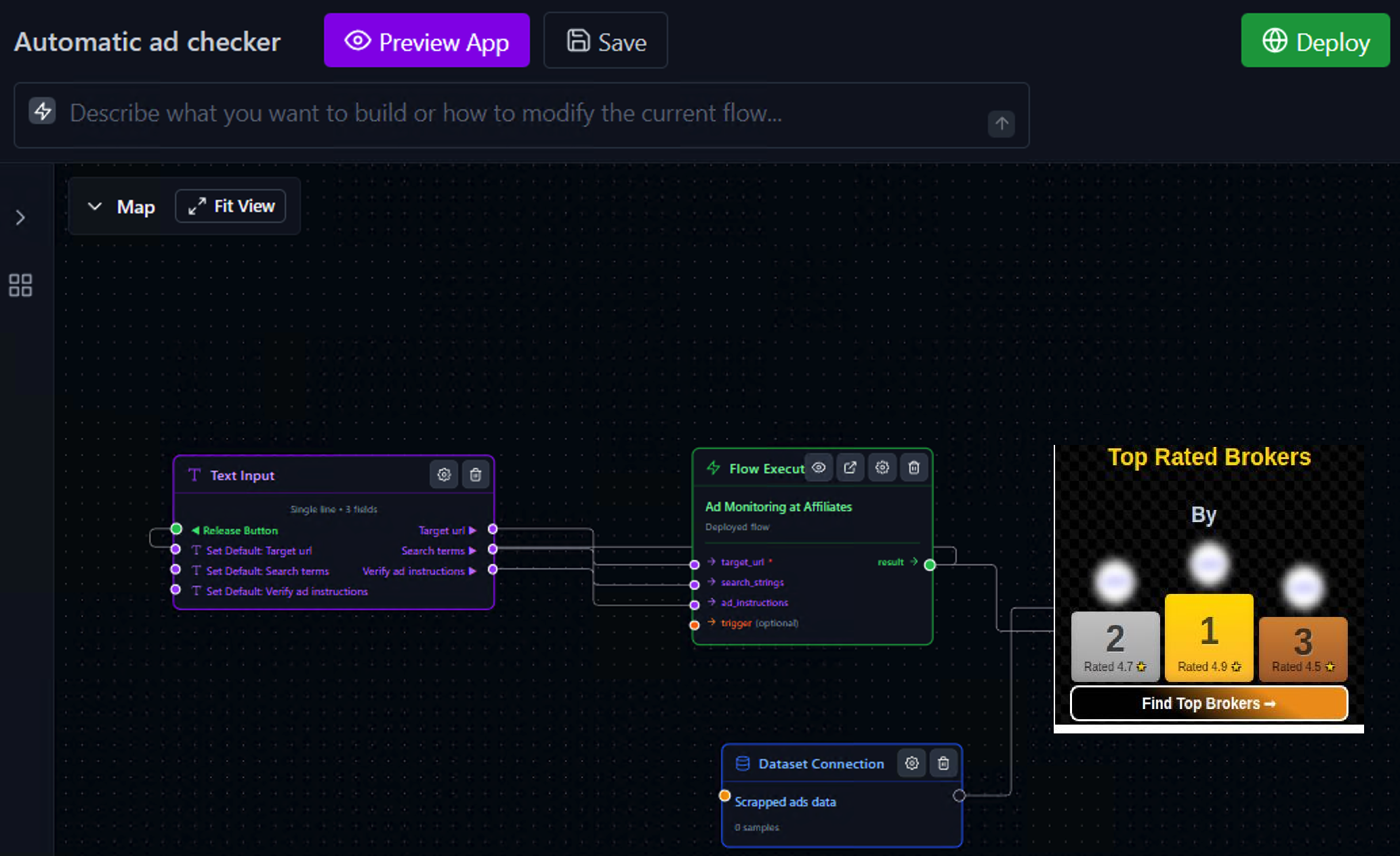 This advanced flow uses browser automation to scan websites for ads, capture screenshots, extract text, and validate compliance using GPT-4.1. Let's break down the key stages.